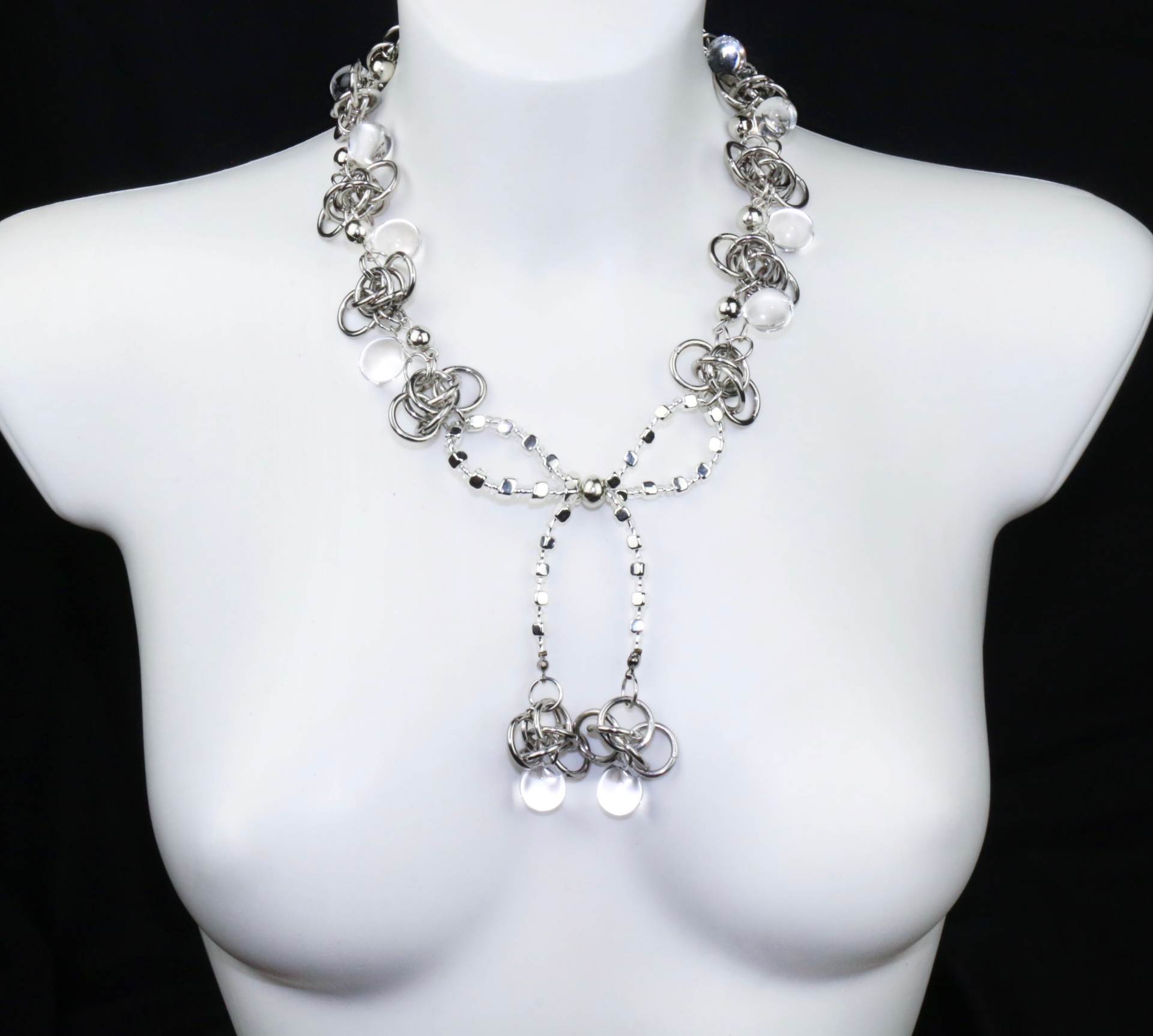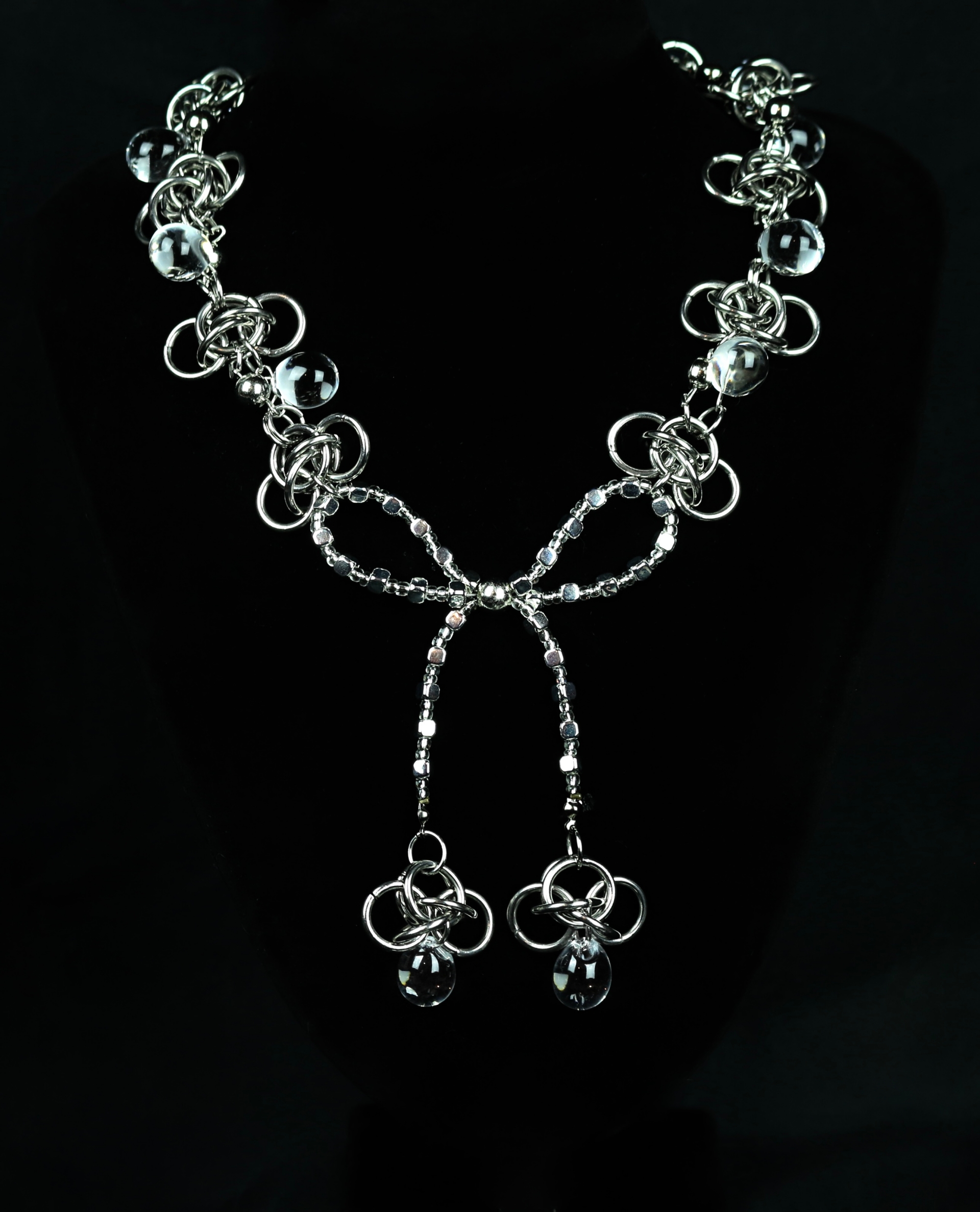 Handmade beaded necklace with silver beads, resin tear drop beads & stainless steel rings. Only a few available.