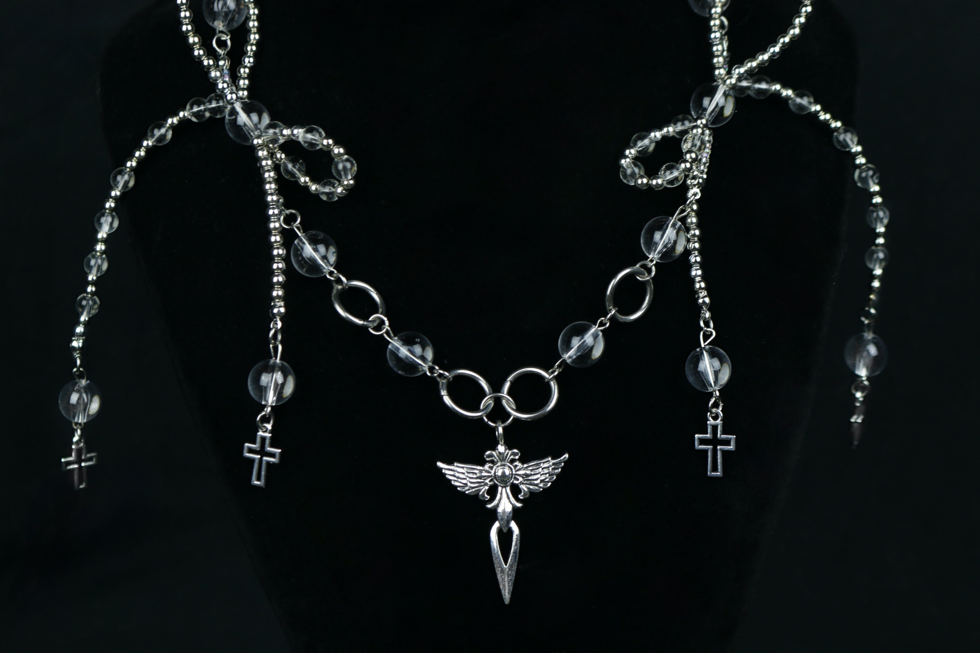 Handmade necklace with unique resin beads, stainless steel chain and cross charms. Unique piece, only a few available.