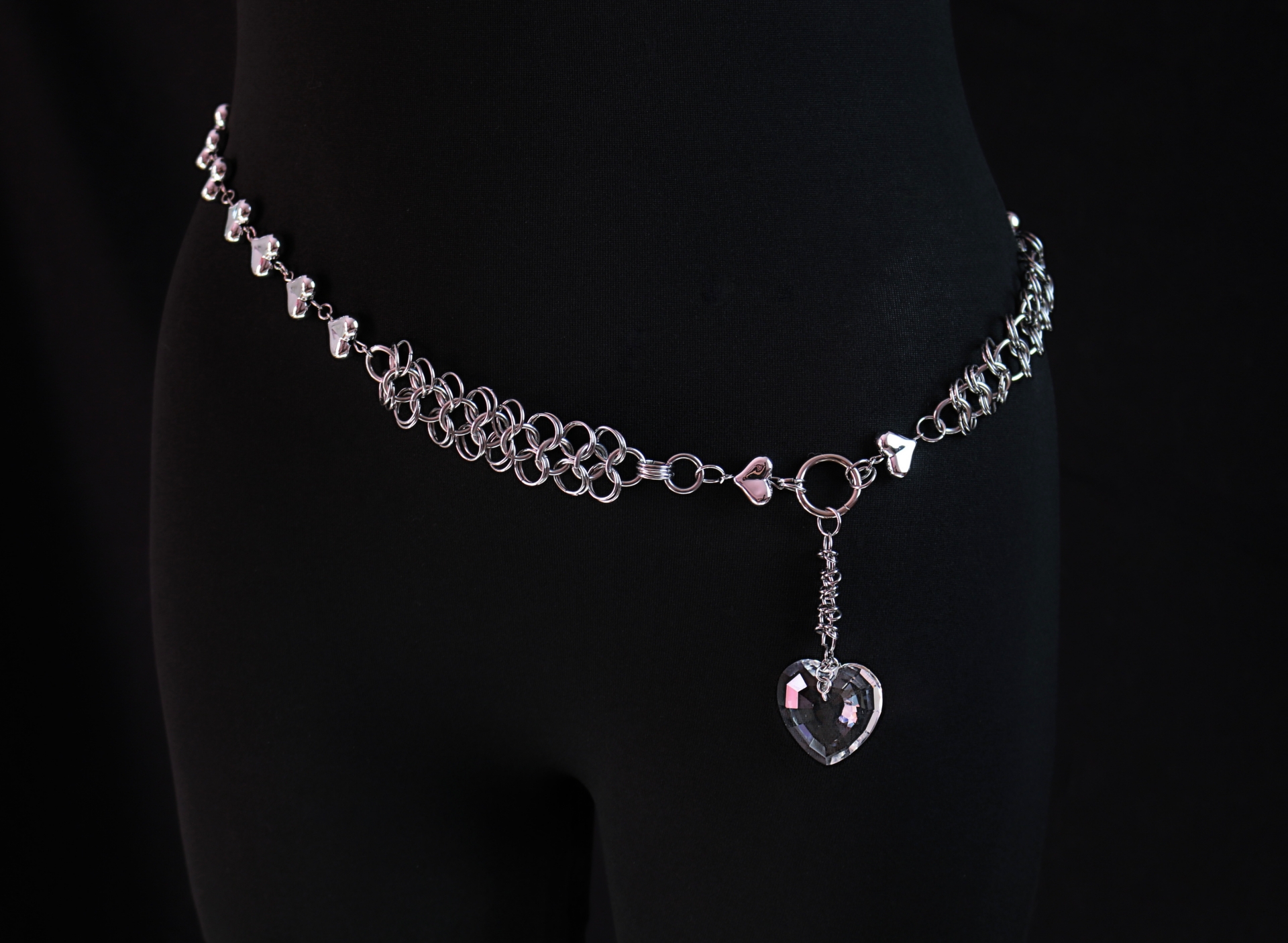 Handmade stainless steel waist chain / body chain with glass crystal heart charm. Can be worn around the waist, around the lower hip area or as a long necklace.