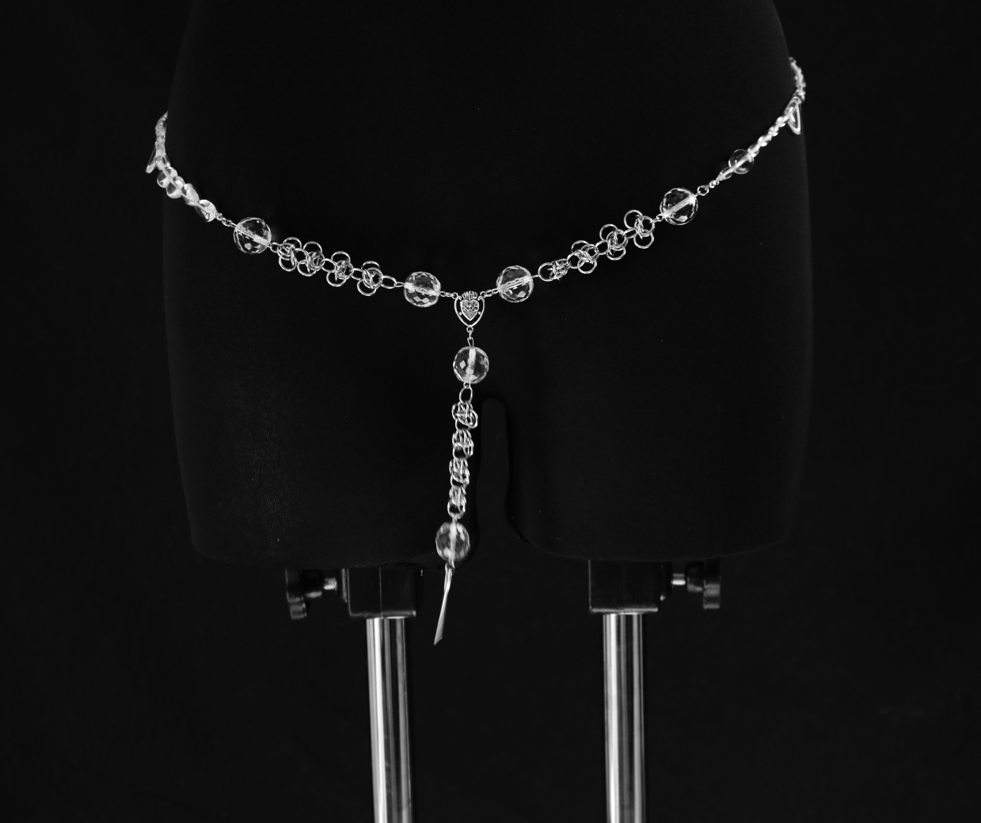 Handmade stainless steel waist chain / body chain with unique glass beads and needle charm. Can be worn around the waist, around the lower hip area or as a long necklace.
