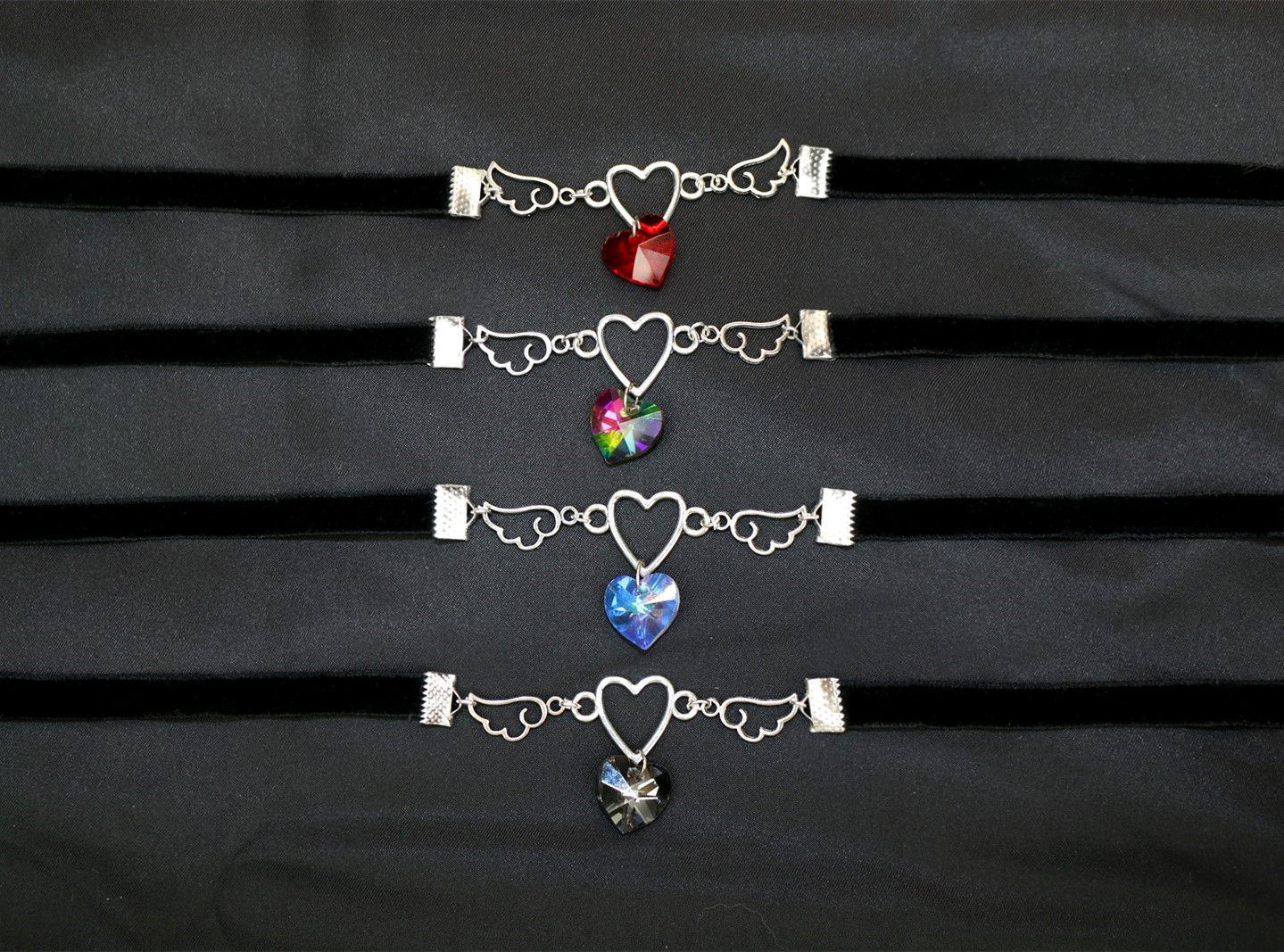 Black velvet choker with crystal heart charms.