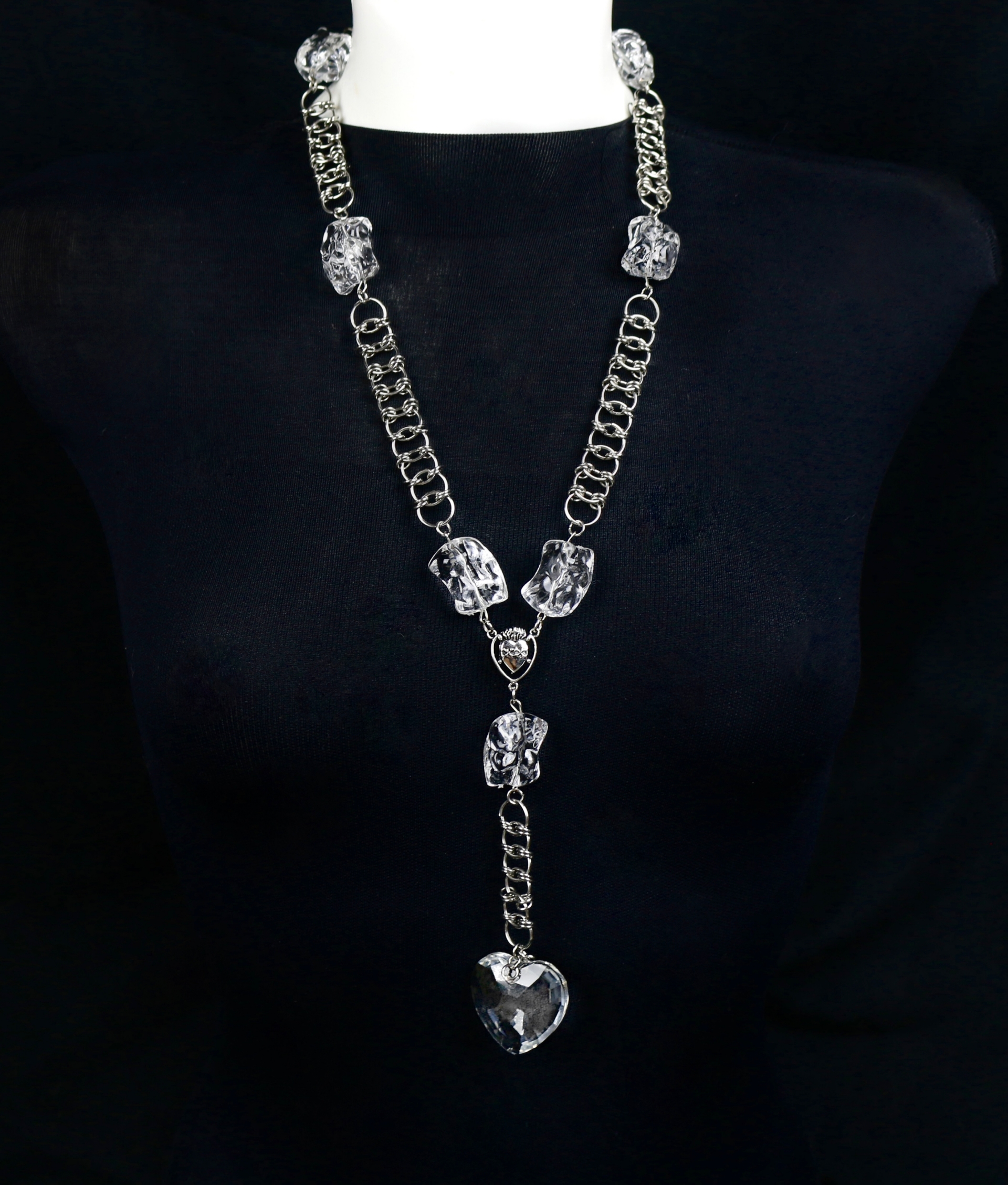 Handmade rosary necklace with chainmaille chain, resin frozen ice bead and crystal glass heart charm. Only once available.