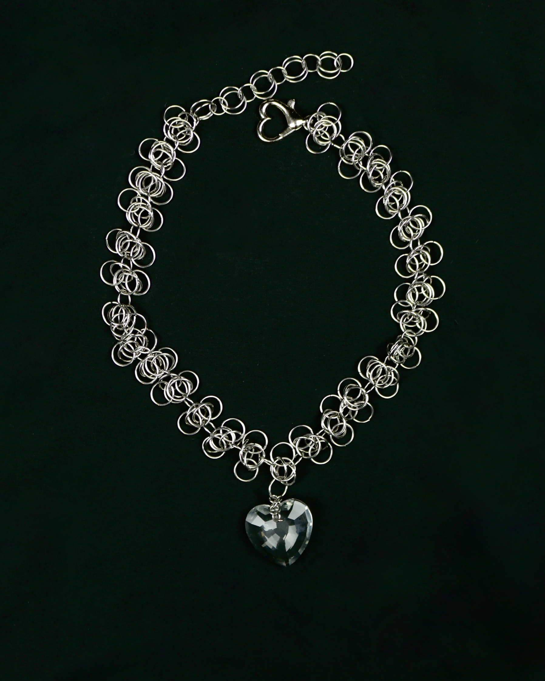 Handmade stainless steel chainmaille necklace with glass heart charm. Unique piece, only a few available.