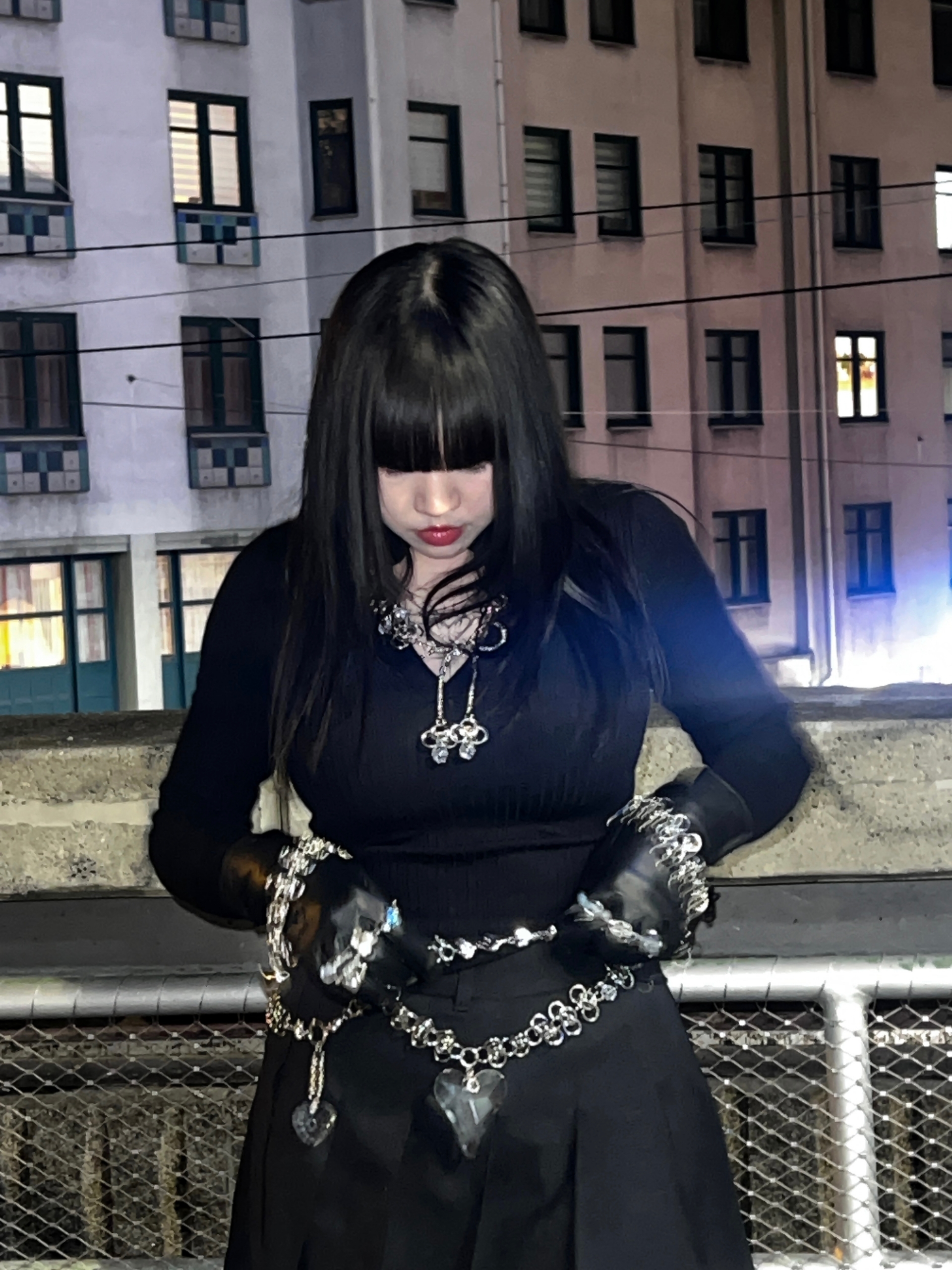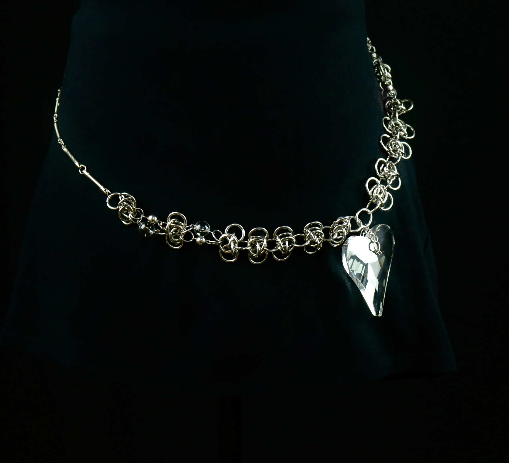 Handmade stainless steel chainmaille waist chain / body chain with big glass crystal heart charm. Can be worn around the waist, around the lower hip area or as a long necklace.