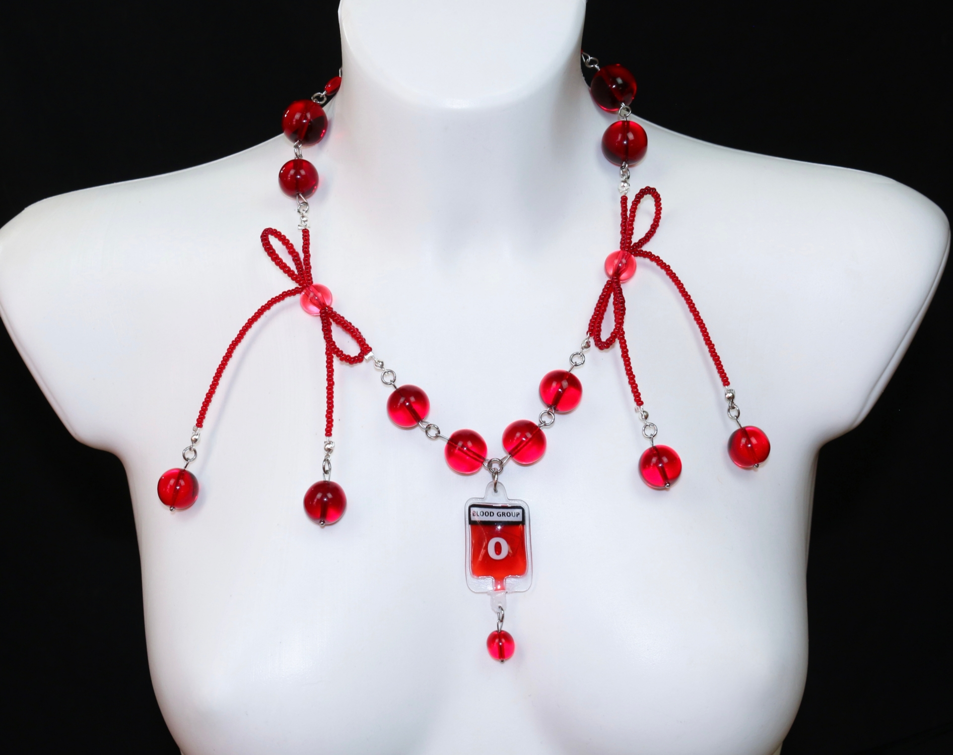 Handmade necklace with blood red glass beads and a special blood IV bag charm.