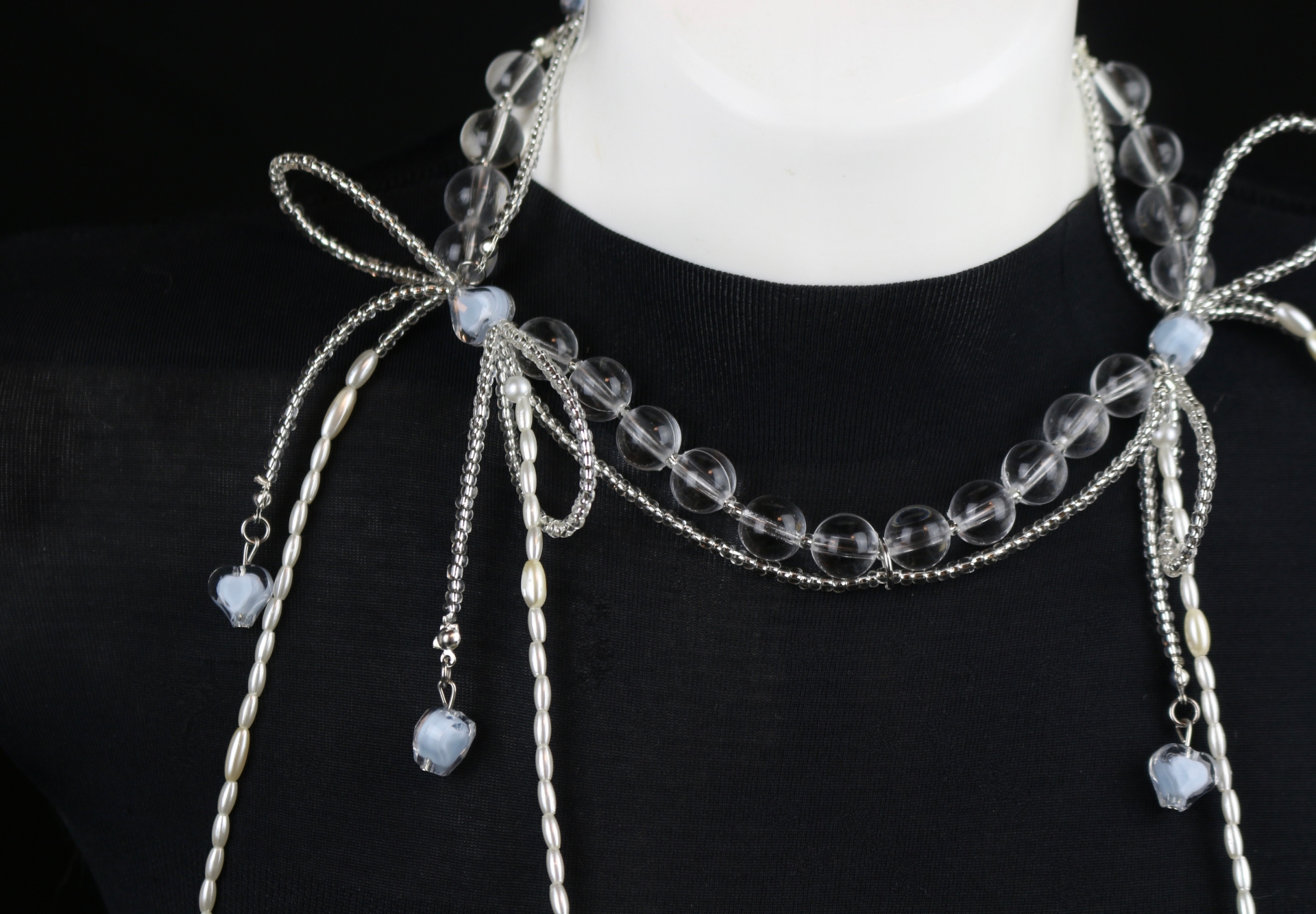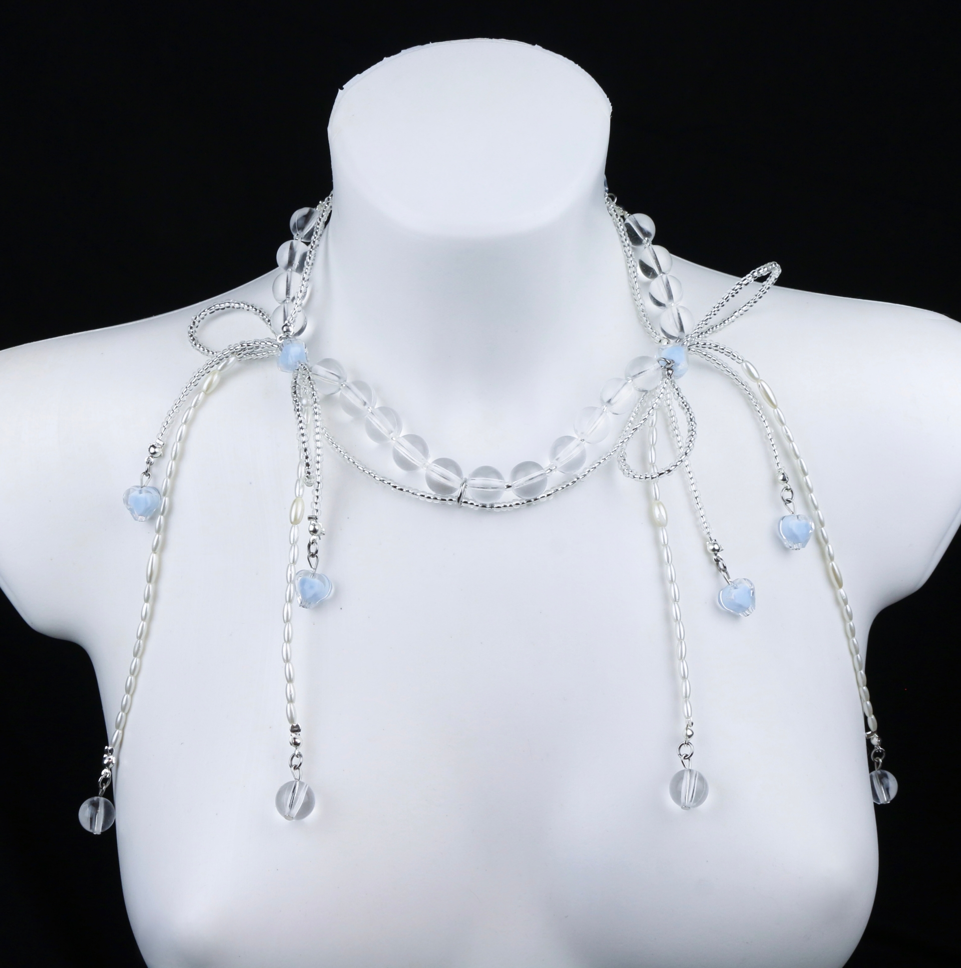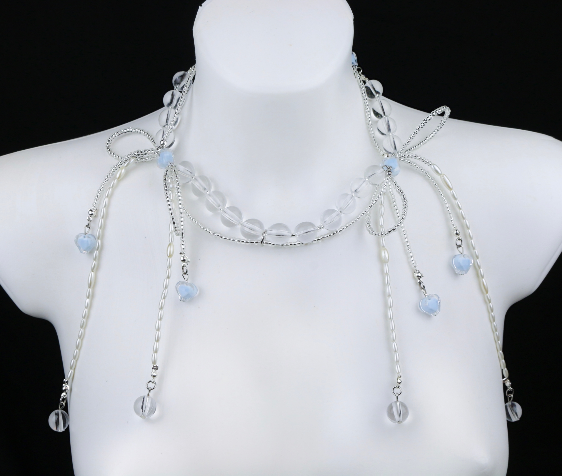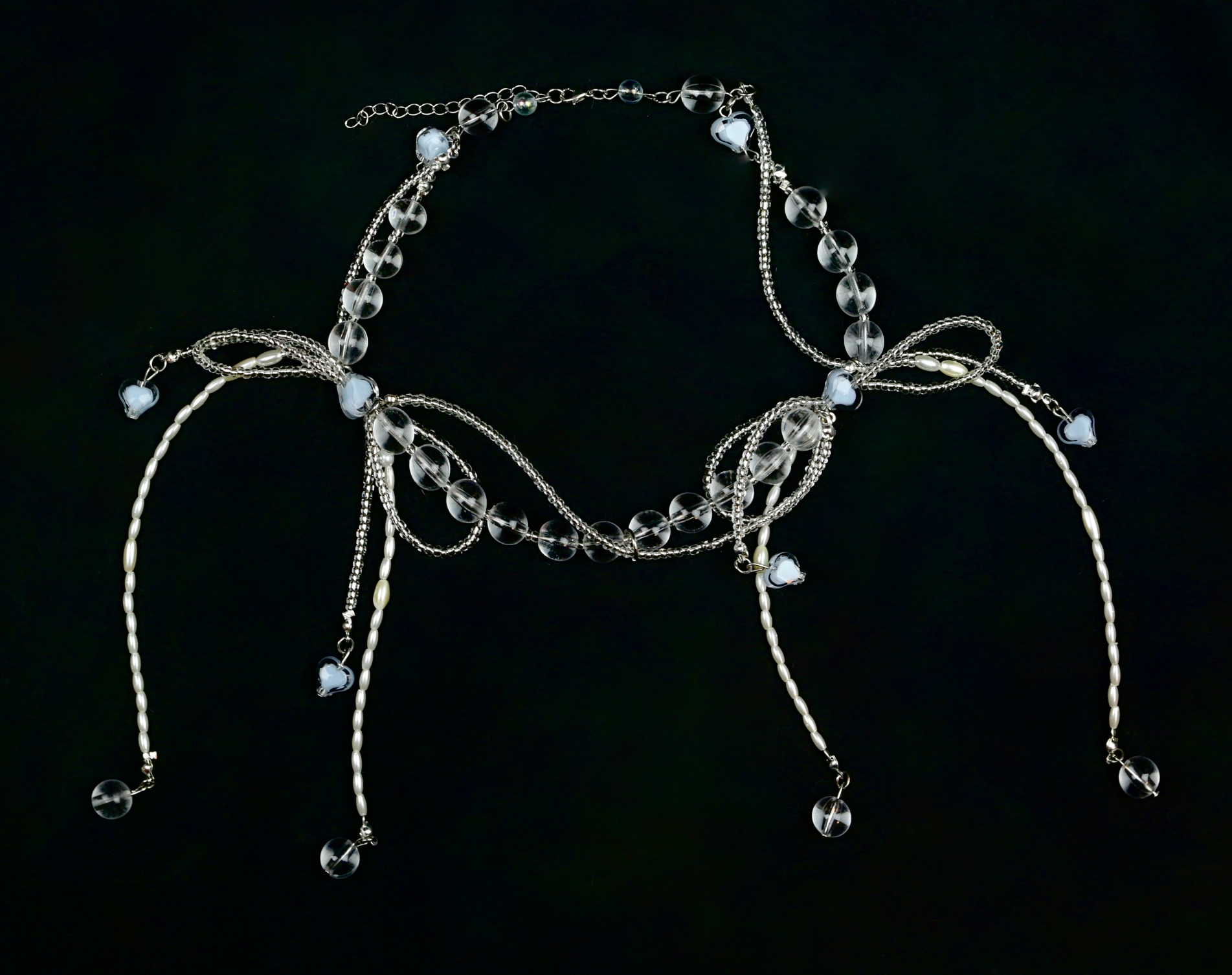 Handmade beaded necklace with glass beads and light blue heart charms. Unique piece only a few available. Adjustable closure.