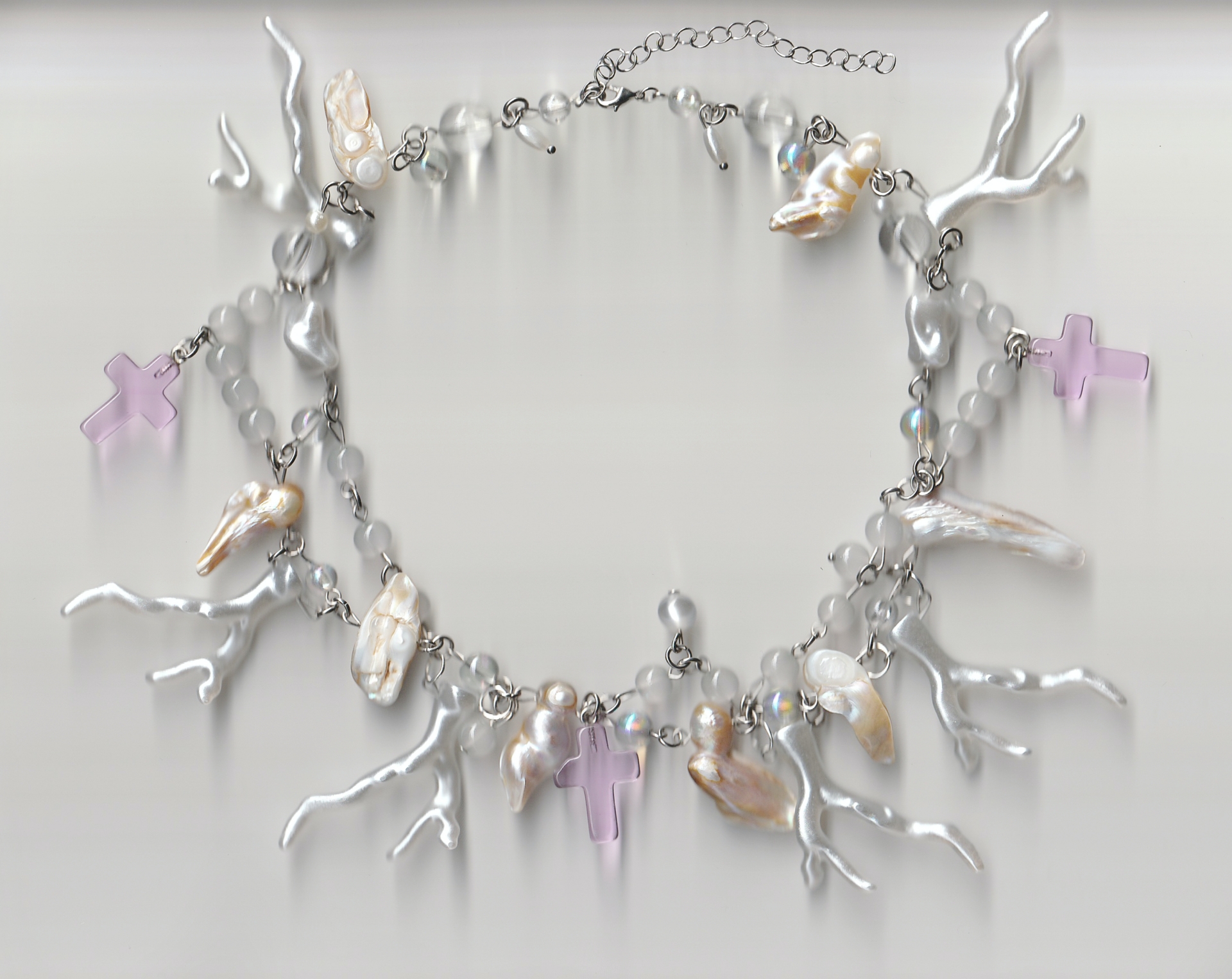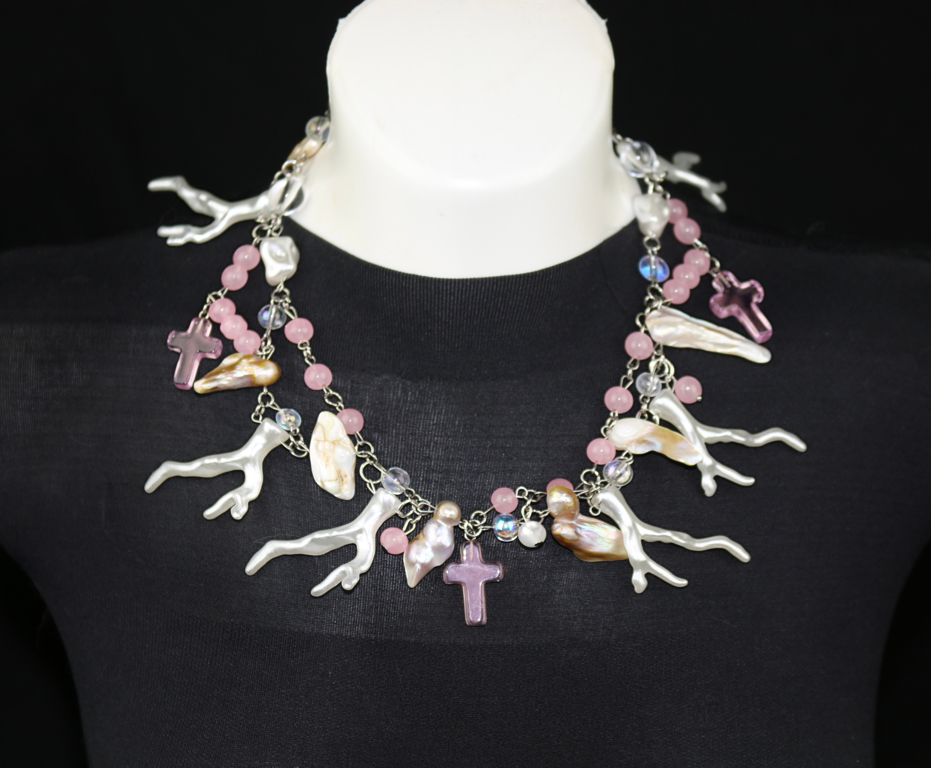 Handmade beaded necklace with unique beads and fresh water pearls and faux pearls. Unique piece. Adjustable closure.