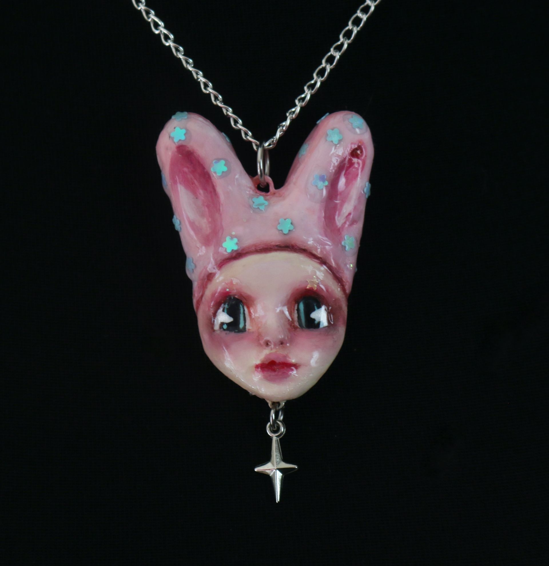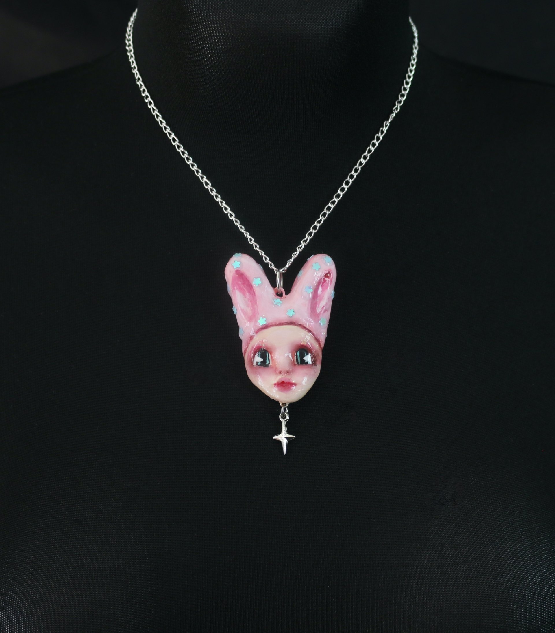 Handmade doll face necklace coated with durable resin varnish for long lasting wear. Unique piece, only one available.