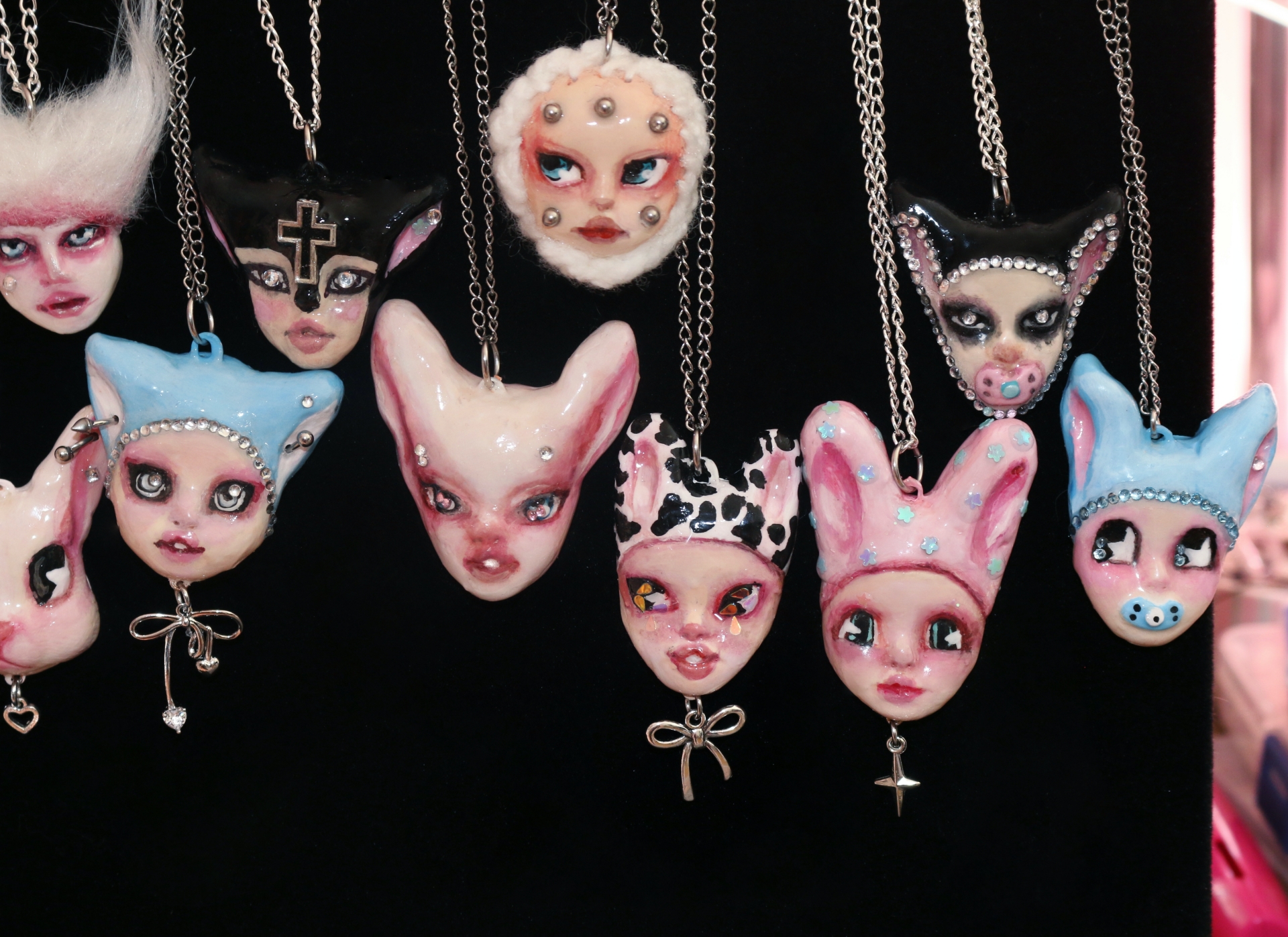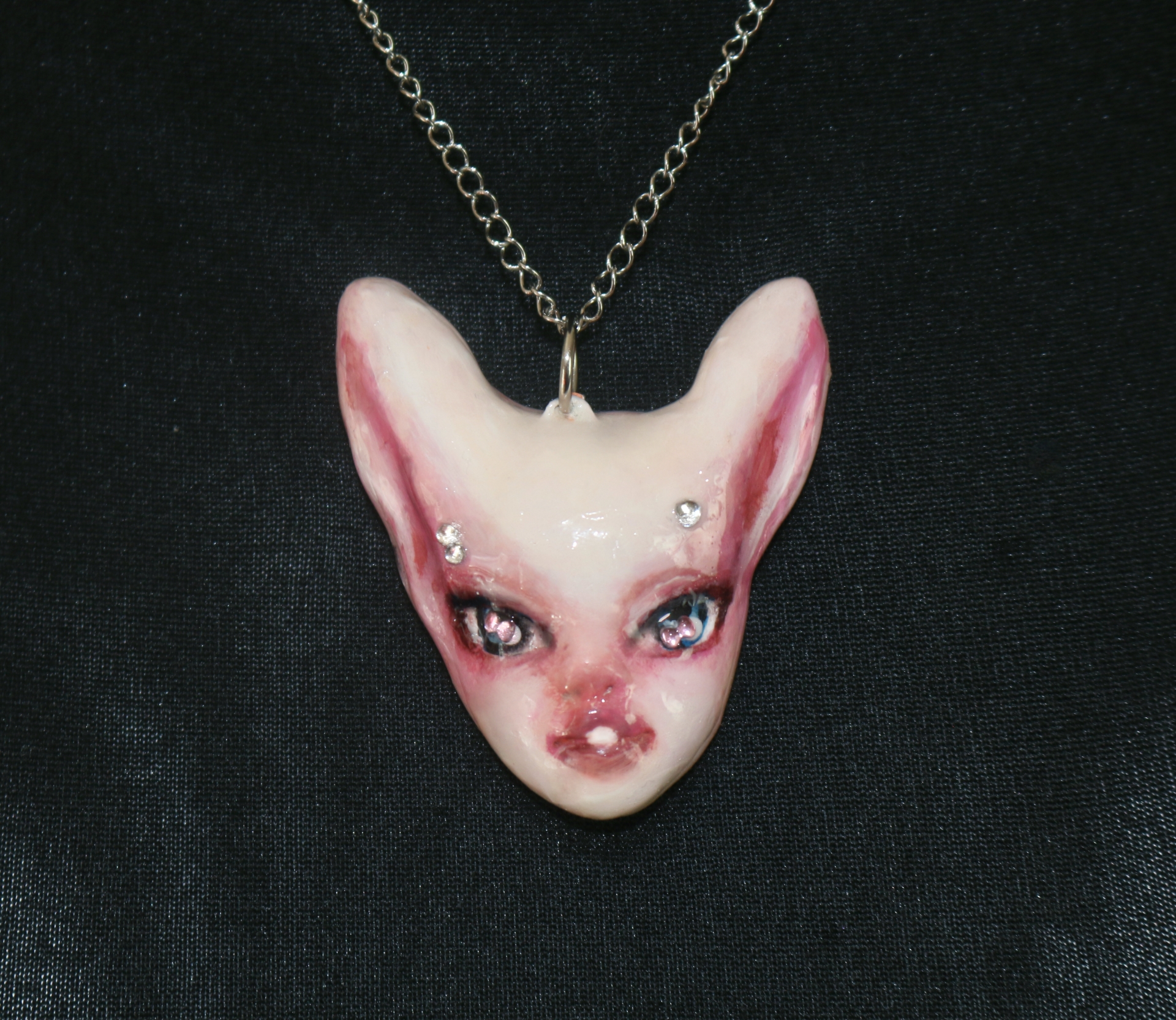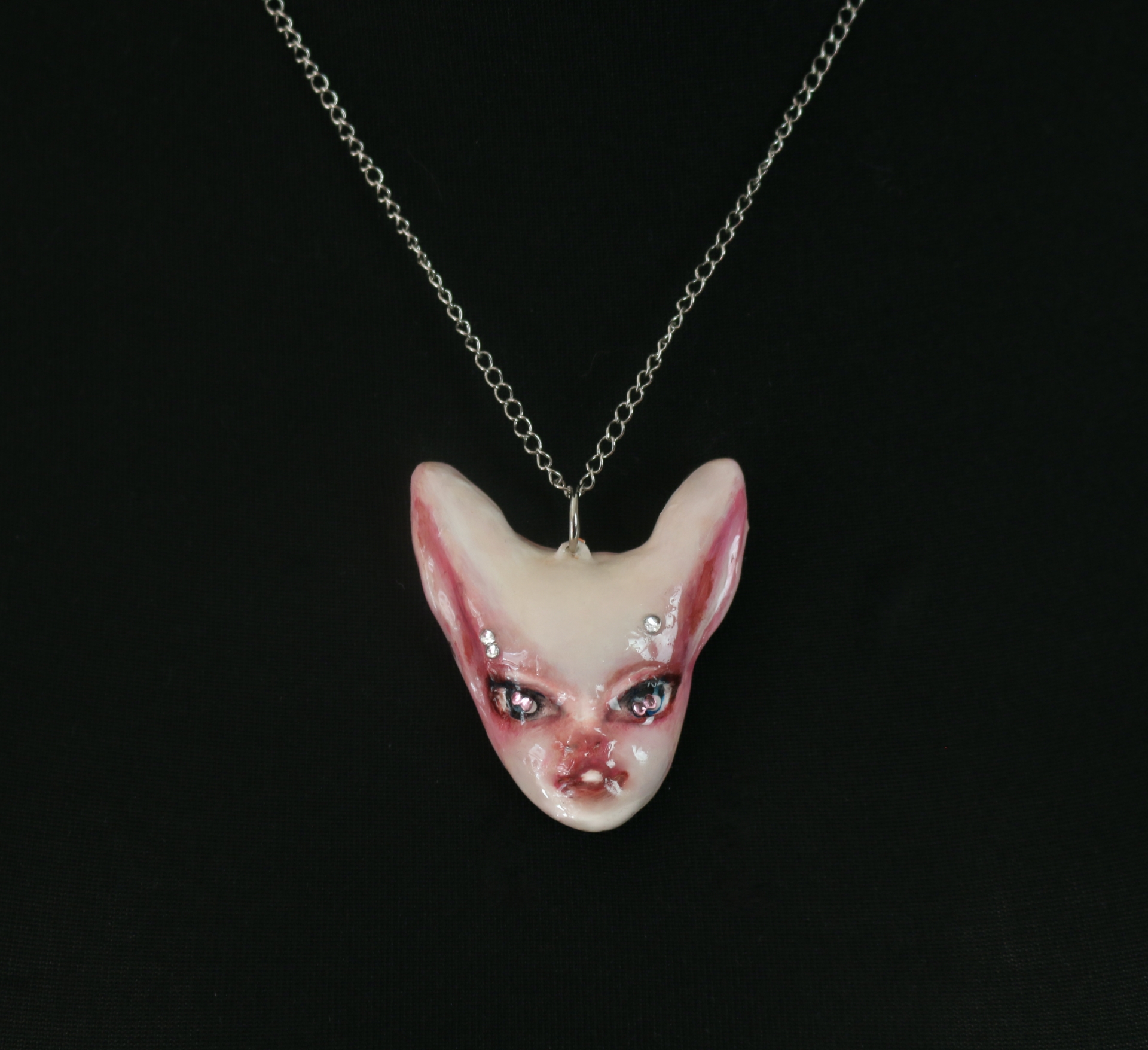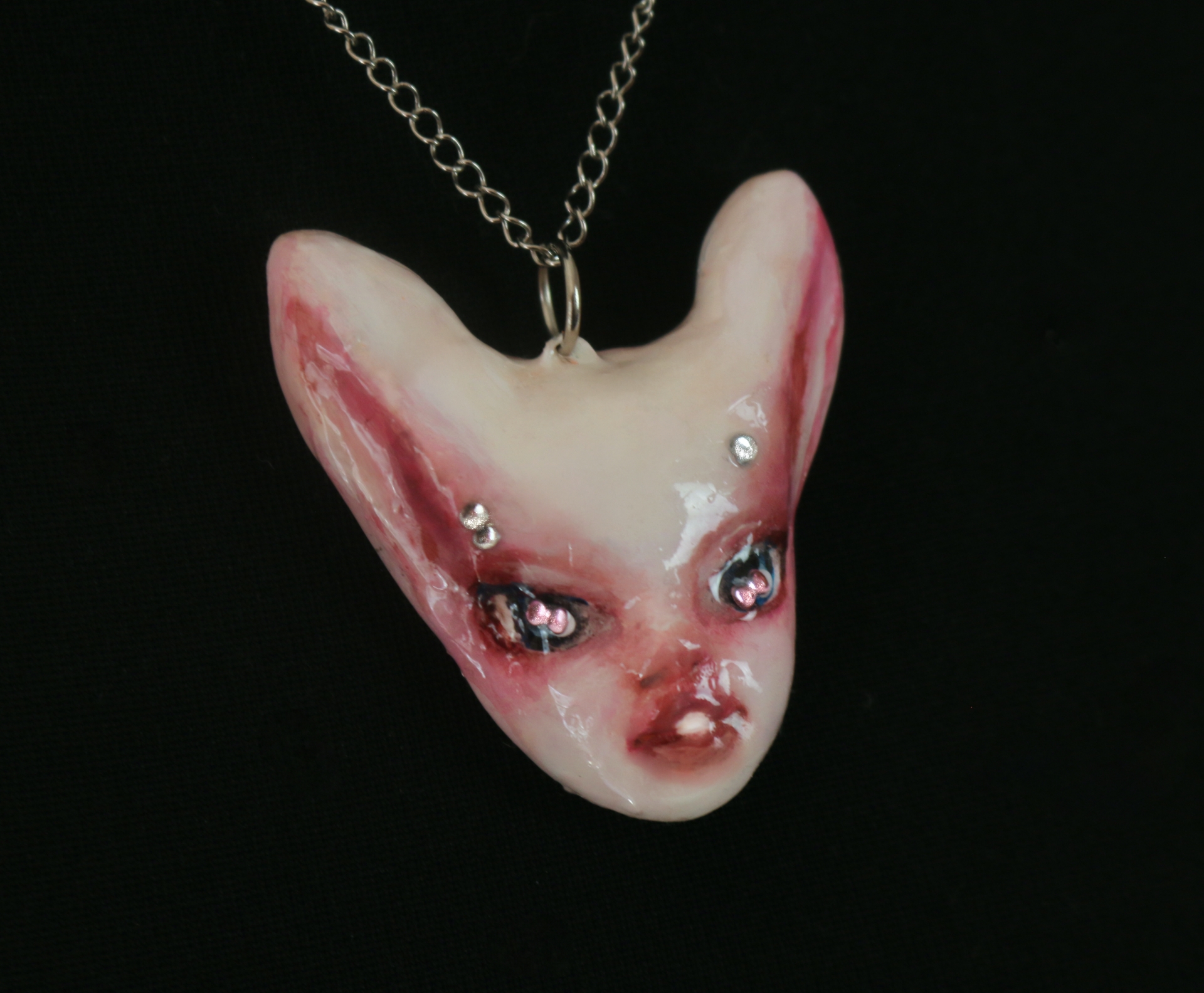 Handmade doll face necklace coated with durable resin varnish for long lasting wear. Unique piece, only one available.
