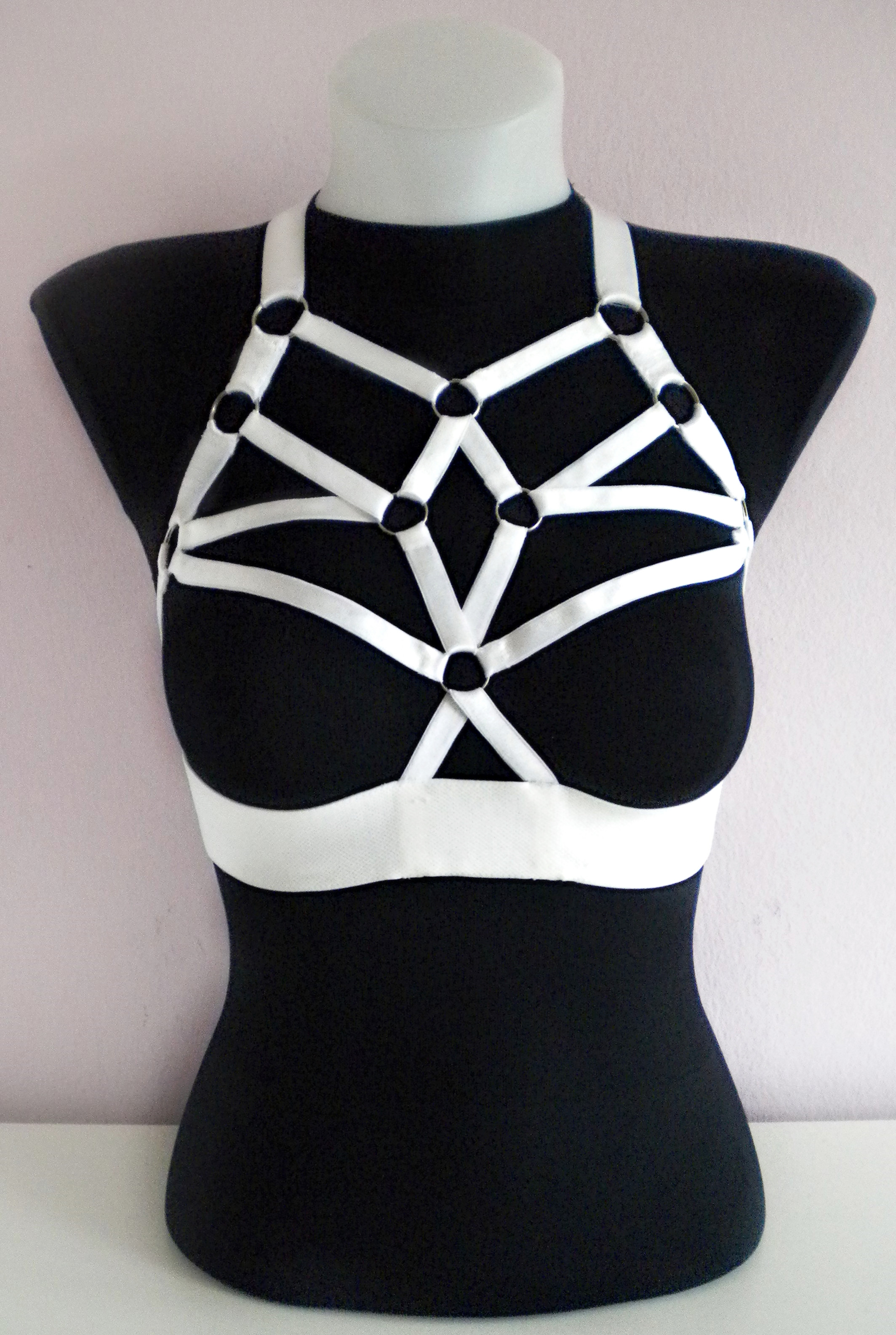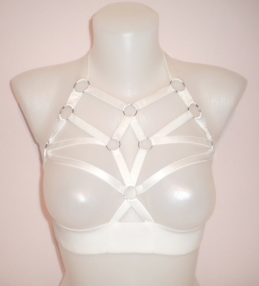 Made with white soft elastic knit band, white elastic satin and different size O - rings.